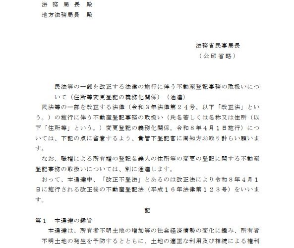 民法等の一部を改正する法律の施行に伴う不動産登記事務の取扱いについて(住所等変更登記の義務化関係)(通達)〔令和7年 10月30日付法務省民二第915号〕 民法等の一部を改正する法律の施行に伴う不動産登記事務の取扱いについて(住所等変更登記の義務化関係)(通達)〔令和7年 10月30日付法務省民二第915号〕 民法等の一部を改正する法律の施行に伴う不動産登記事務の取扱いについて(住所等変更登記の義務化関係)(通達)〔令和7年 10月30日付法務省民二第915号〕ダウンロード 関連記事(自動表示): 【差替後】民法等の一部を改正する法律の施行に伴う不動産登記事務の取扱いについて(所有権の登記の登記事項の追加関係)(通達)〔令和6年3月22日付法務省民二第551号〕 【修正】民法等の一部を改正する法律の施行に伴う不動産登記事務の取扱いについて(民法改正関係)(通達)〔令和5年3月 28 日付法務省民二第 533 号〕について、一部誤りを修正 民法等の一部を改正する法律の施行に伴う不動産登記事務の取扱いについて(相続登記等の申請義務化関係)(通達)令和5年9月12日付け法務省民二第927号通達(令和5年9月21日記載)(令和5年9月25日追記)