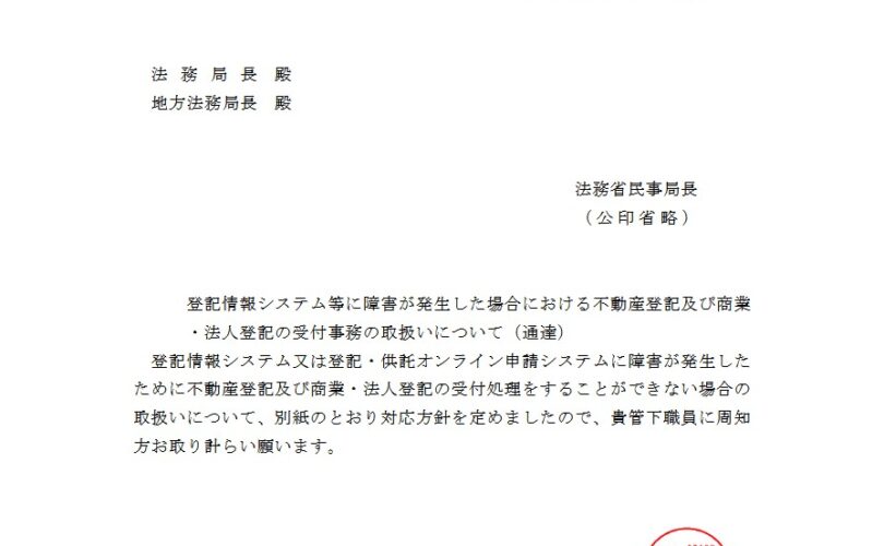 登記情報システム等に障害が発生した場合における不動産登記及び商業・法人登記の受付事務の取扱いについて(通達)〔令和7年11月10日付法務省民二第1155号〕 登記情報システム等に障害が発生した場合における不動産登記及び商業・法人登記の受付事務の取扱いについて(通達)〔令和7年11月10日付法務省民二第1155号〕 登記情報システム等に障害が発生した場合における不動産登記及び商業・法人登記の受付事務の取扱いについて(通達)〔令和7年11月10日付法務省民二第1155号〕ダウンロード 関連記事はありません。