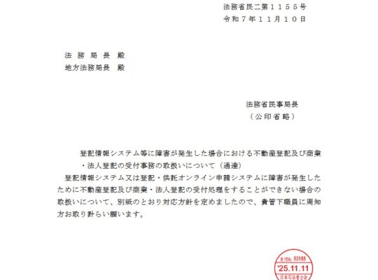 登記情報システム等に障害が発生した場合における不動産登記及び商業・法人登記の受付事務の取扱いについて(通達)〔令和7年11月10日付法務省民二第1155号〕